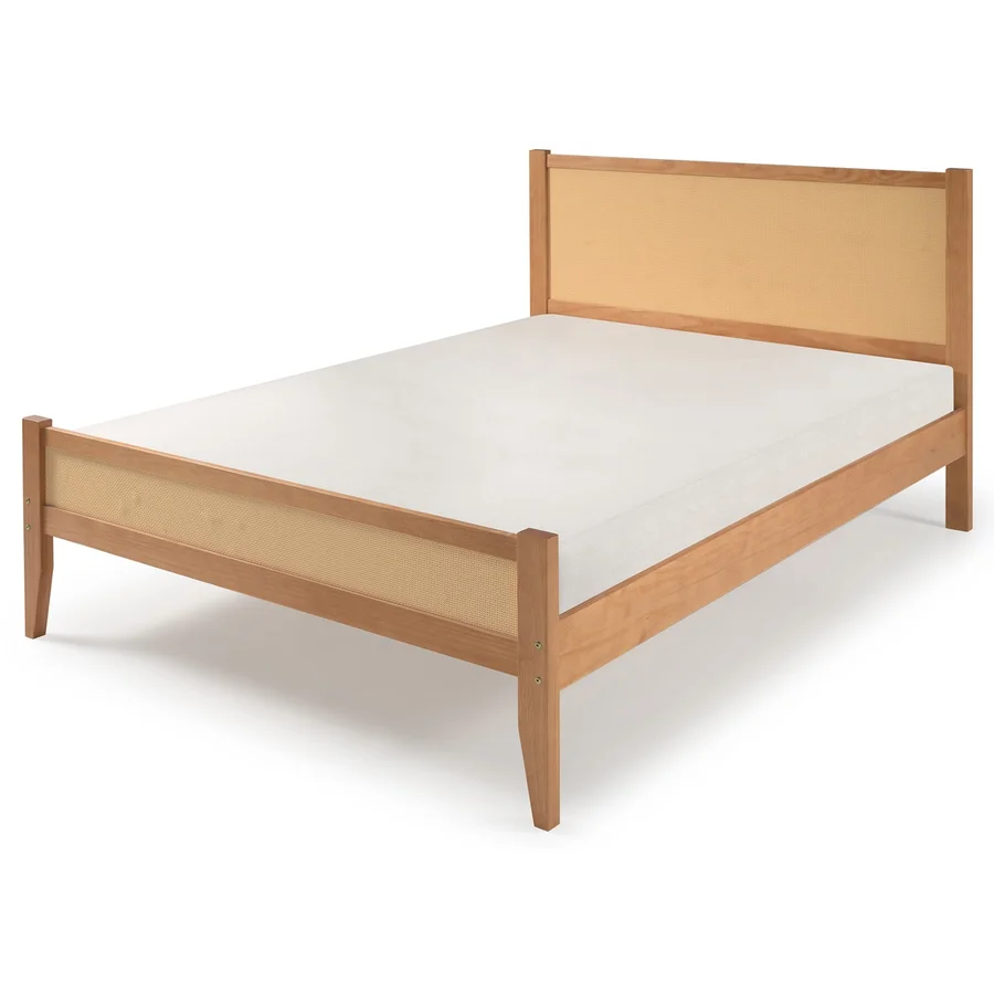 O destaque do design está na cabeceira com detalhe em palhinha natural, que traz leveza, textura e um charme atemporal ao móvel. A composição entre madeira maciça e palhinha cria uma estética delicada e contemporânea, perfeita para quem busca um quarto bem decorado sem abrir mão da funcionalidade.