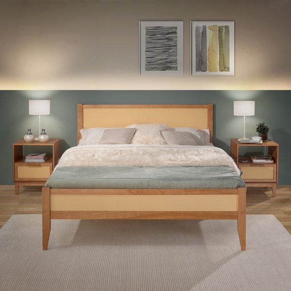 O destaque fica por conta da cabeceira com detalhe em palhinha natural, que adiciona textura artesanal e leveza ao ambiente. A combinação da madeira com a palhinha cria um efeito moderno e atemporal, perfeito para quem deseja um quarto elegante e equilibrado.