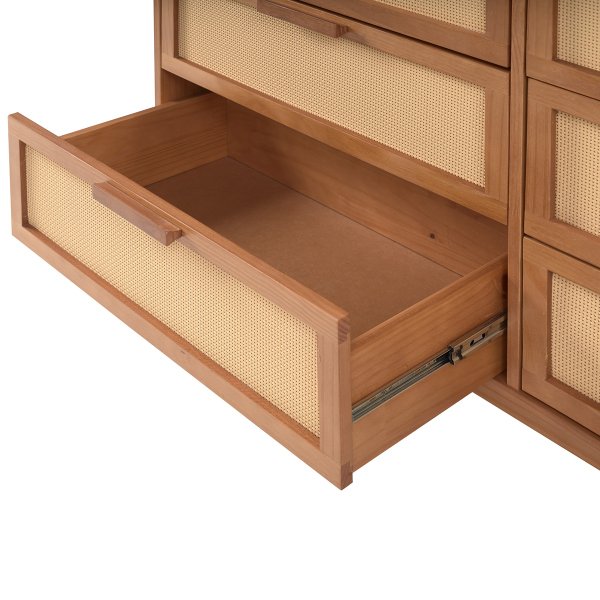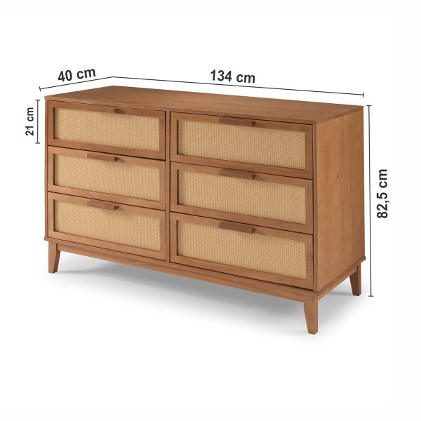 Uma peça robusta, com grande capacidade de armazenamento e acabamento de fácil manutenção, pensada para ambientes que precisam de funcionalidade sem abrir mão do estilo. A estrutura em madeira maciça garante durabilidade e resistência, enquanto as frentes das gavetas em palhinha natural adicionam textura e personalidade, sem pesar no visual. O acabamento em verniz caramelo traz um tom acolhedor e atemporal, que combina com sala, closet, quarto adulto ou infantil — de forma orgânica e elegante.