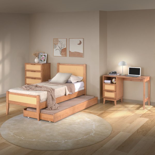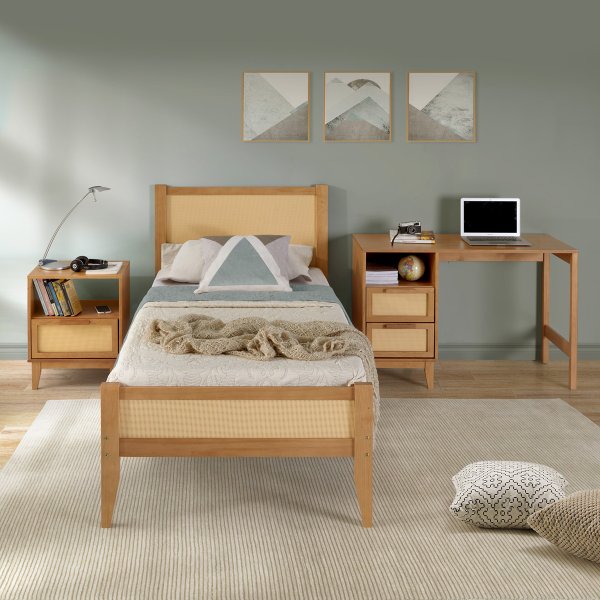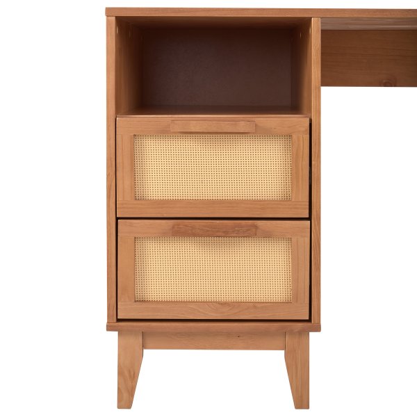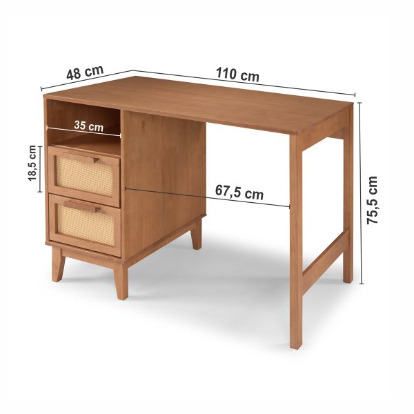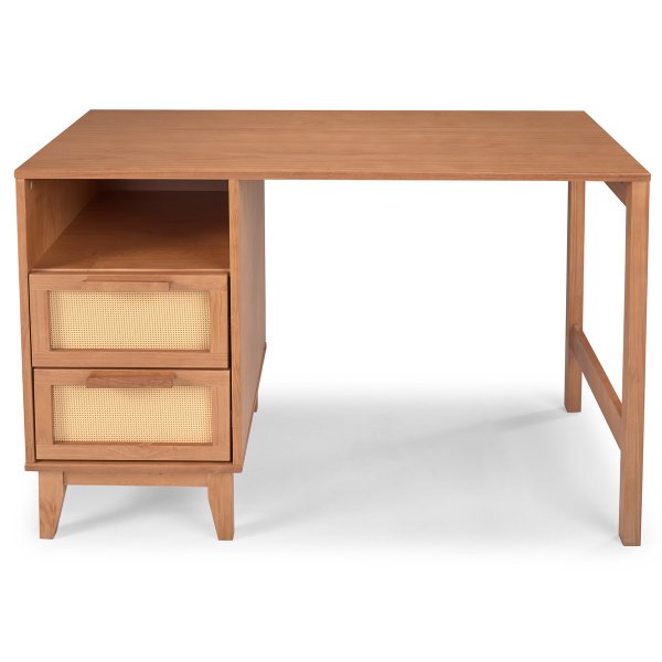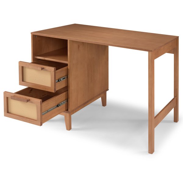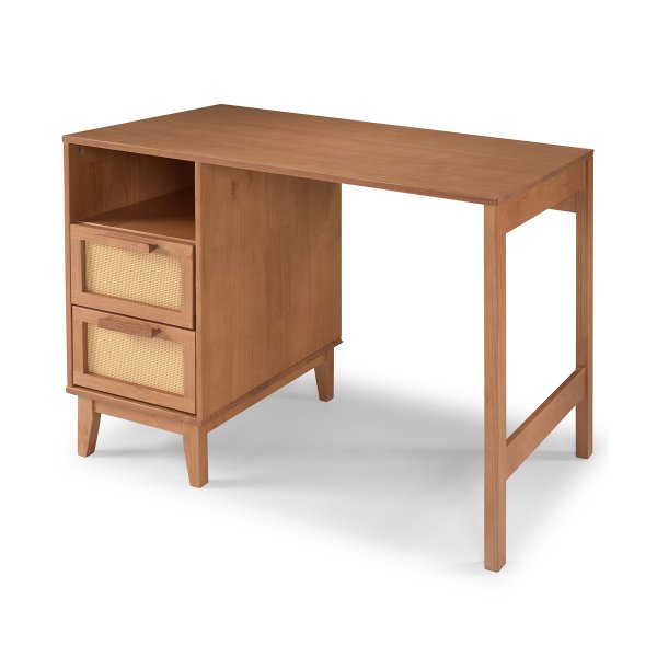 Escrivaninha Slim com 2 gavetas em palhinha – madeira maciça, acabamento caramelo